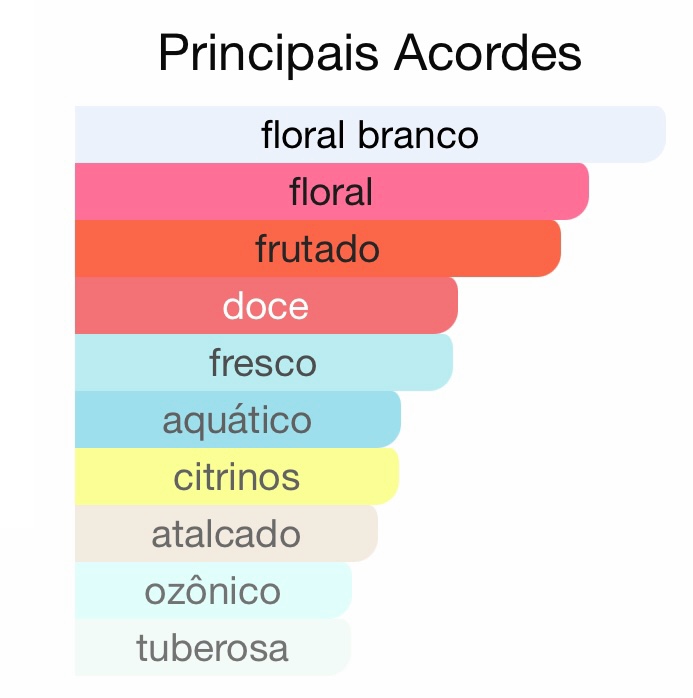 Notas de topo: Ylang-Ylang, Pera, Melão, Magnólia, Pêssego, Mandarina e Bergamota.